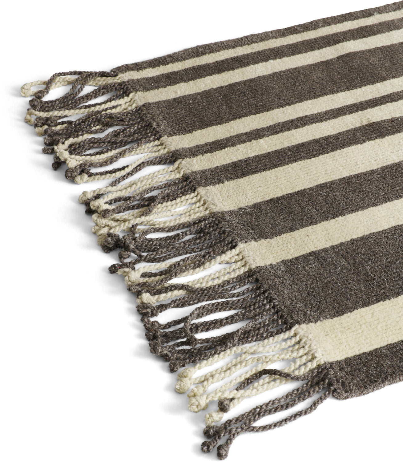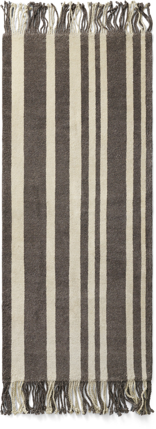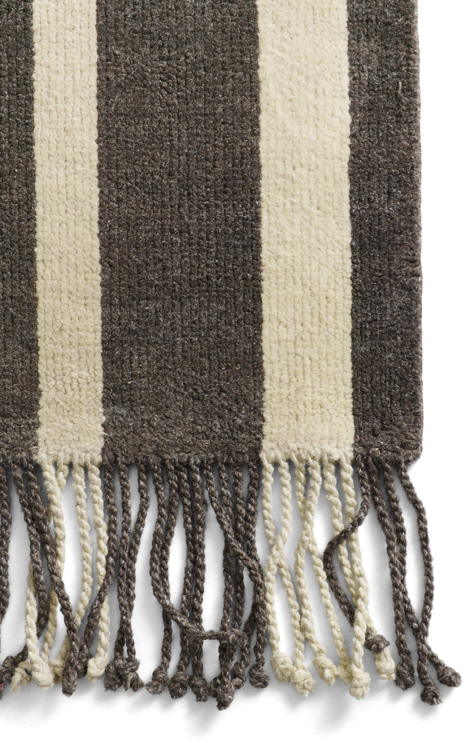Colonnade no.05 is a luxurious hand-knotted rug with soft contrasting stripes in between the dark brown/grey and sandy beige- Long fringes adds an artistic detail.