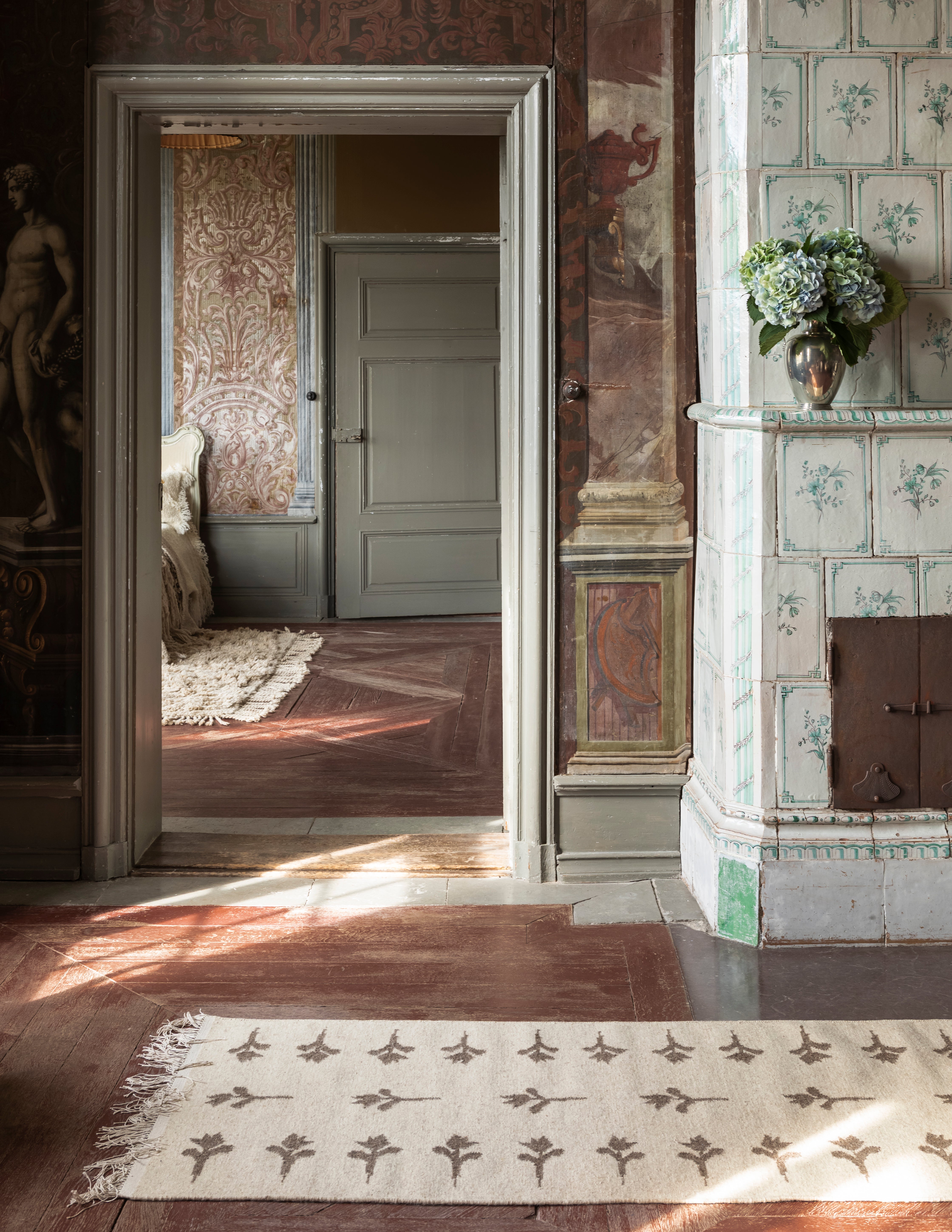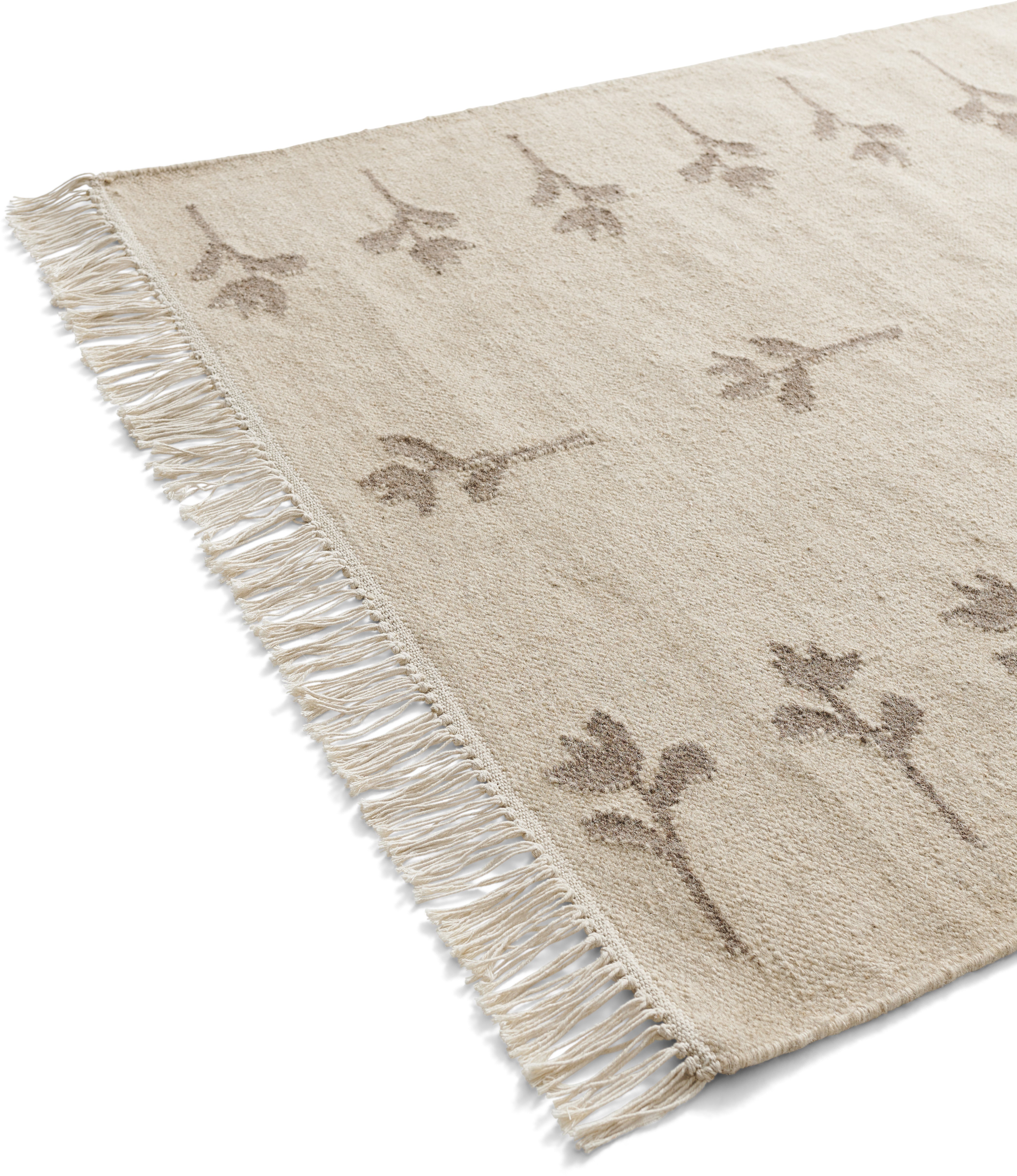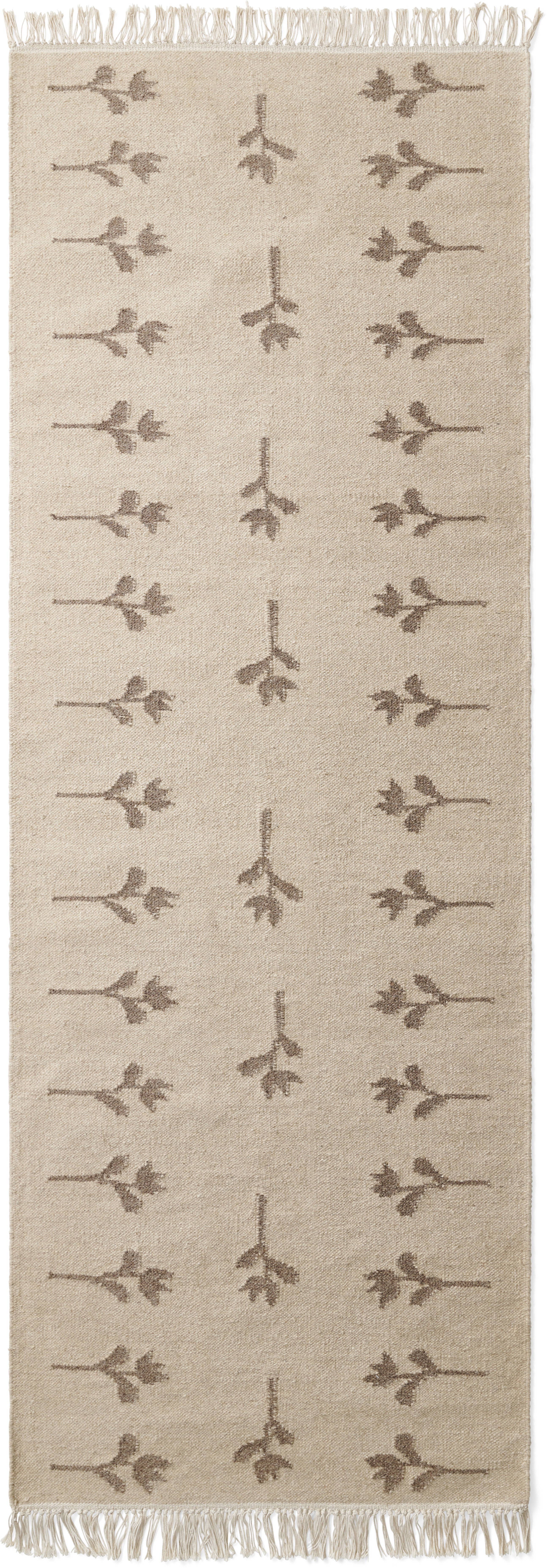 Colonnade no.08 is a light, flat-woven rug in natural wool. The rug is designed in a mid-beige foundation with soft-brown woven flowers that draw inspiration from ancient Scandinavian tulip patterns, A thin fringe row decorates the edges, providing a simple but important detail to the overall design.