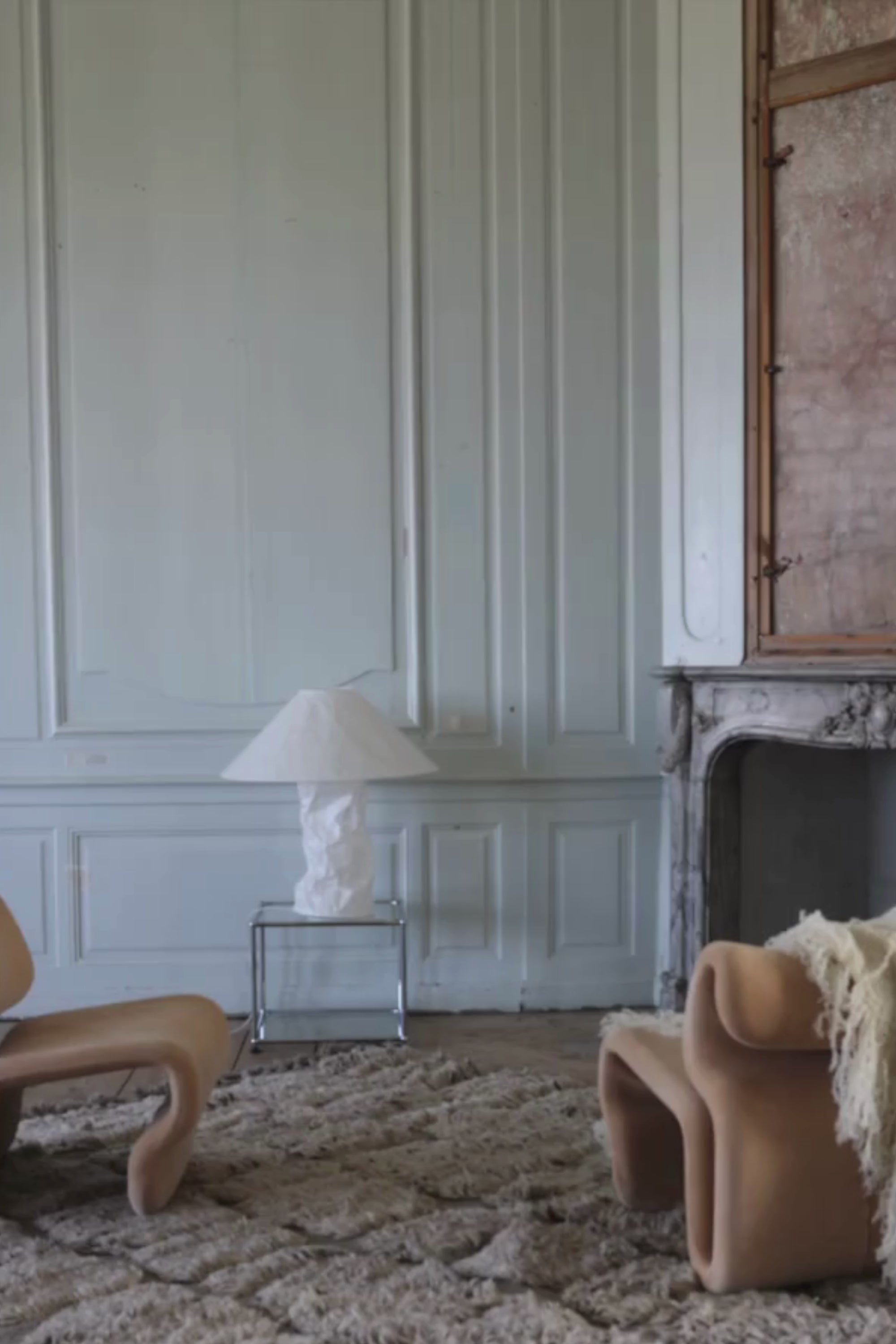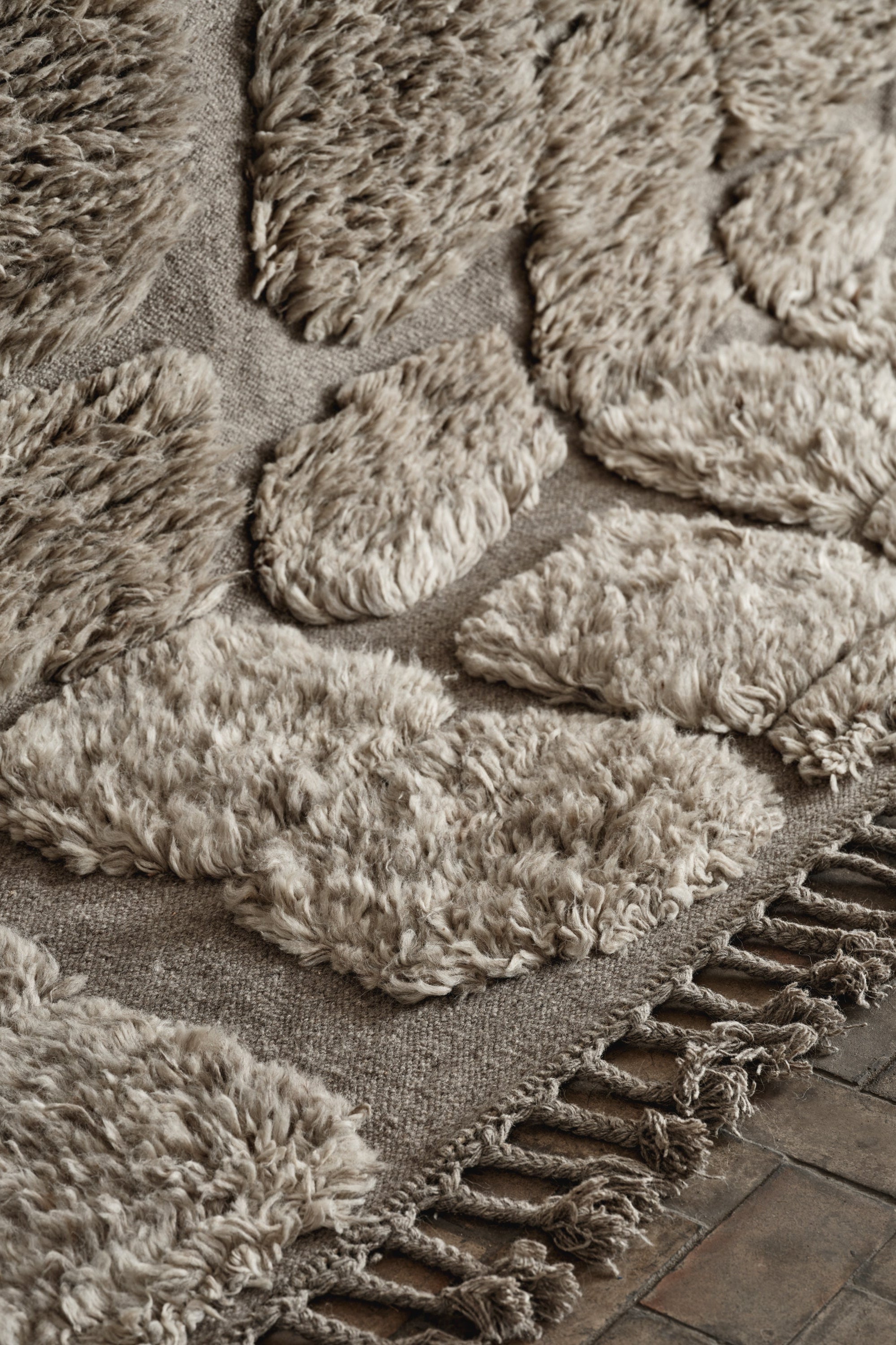 no.03 is a contemporary yet timeless hand-woven rug with soft hand-knotted fields of shaggy wool pattern. The shade is a soft limestone grey/clay color and it's designed with braided chunky fringes on the end line that adds an arty and ethnic detail.