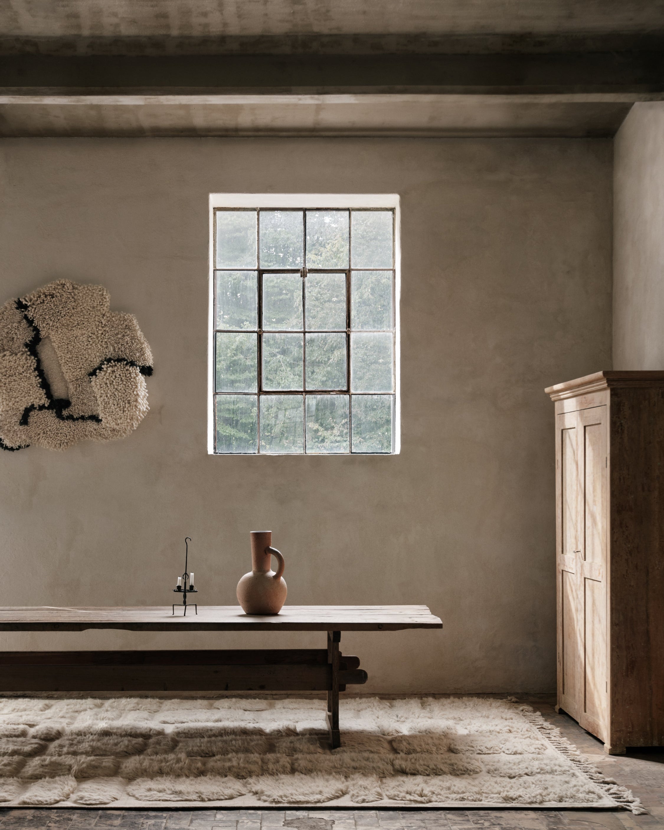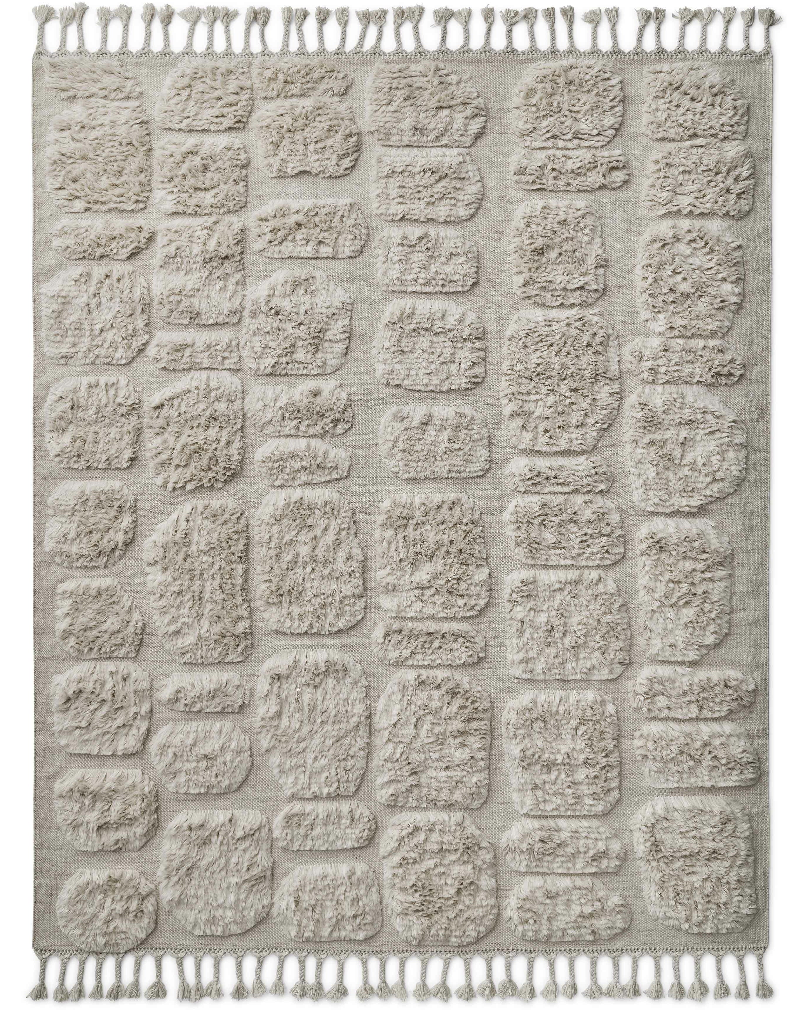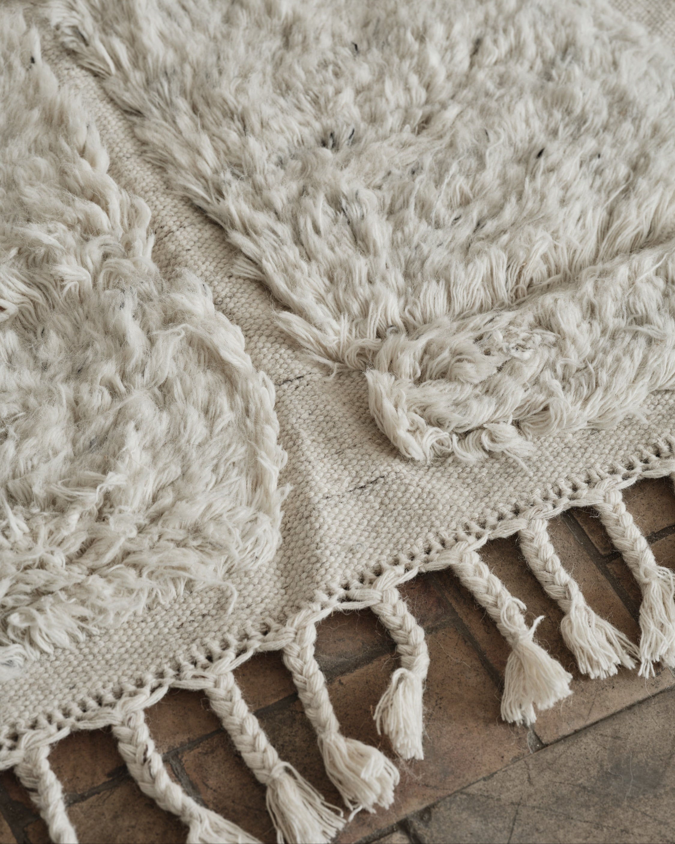 no.05 is a contemporary yet timeless hand-woven rug with soft hand-knotted fields of shaggy wool pattern. Made in the shade "shell", a soft off white color and designed with braided chunky fringes on the end line that adds an arty and ethnic detail.