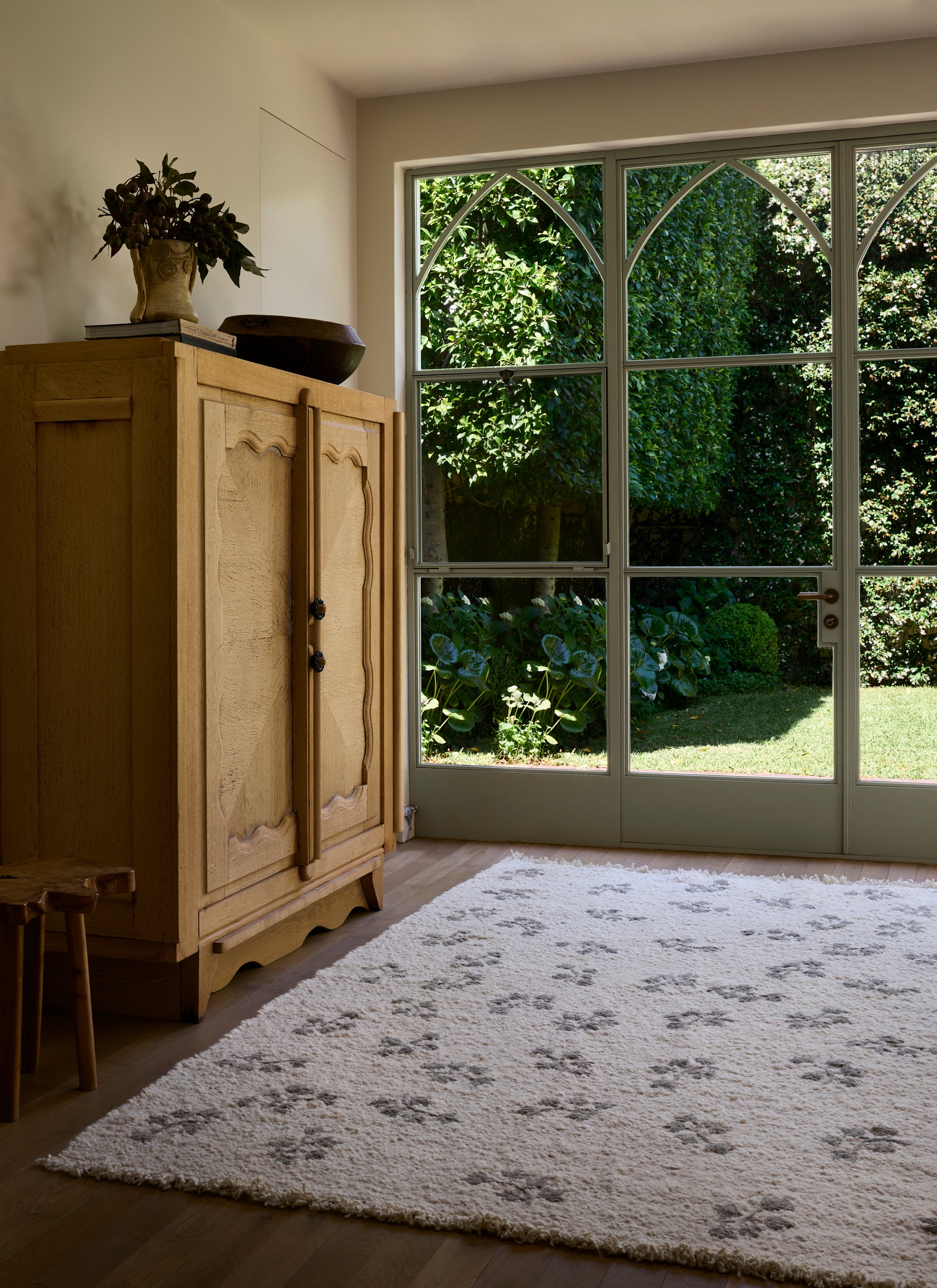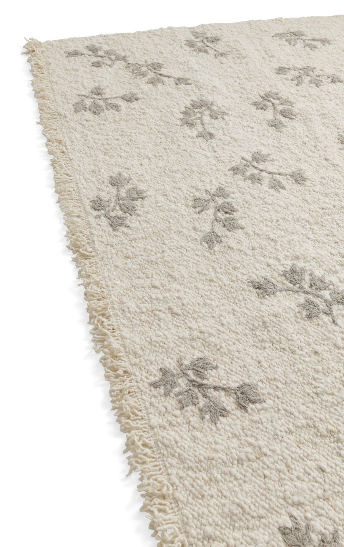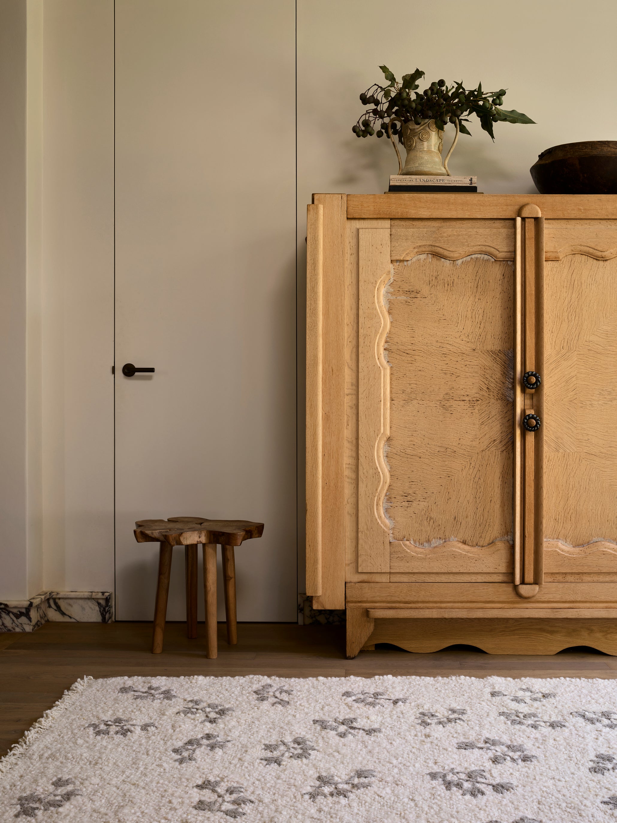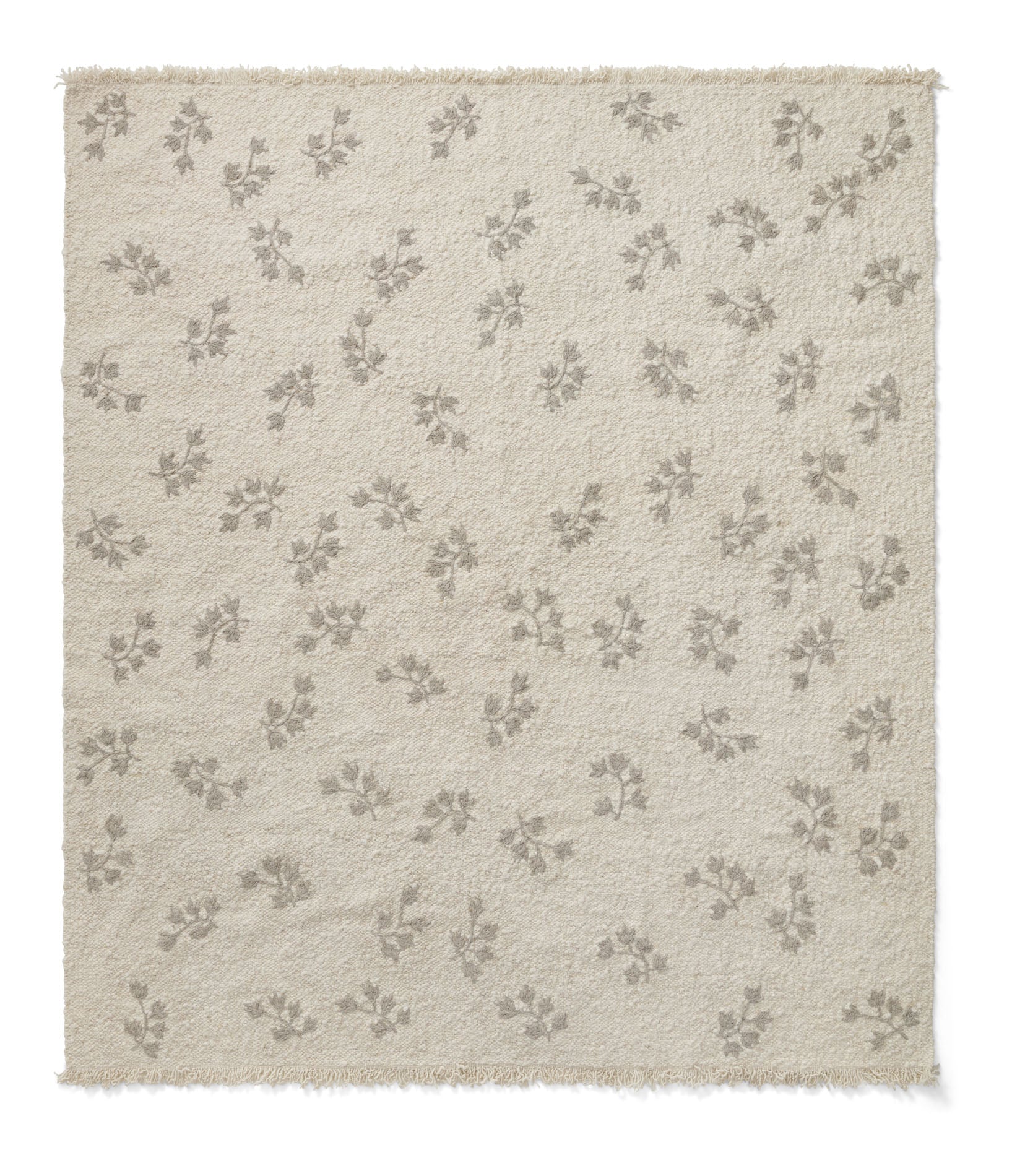 no.16 is made in natural New zealand wool with hand-spun slub yarn, creating a irregular foundation in a chalky off-white shade. The rug is adorned with an hand-embroidered flowers, portraying an interpretation of the French lily.