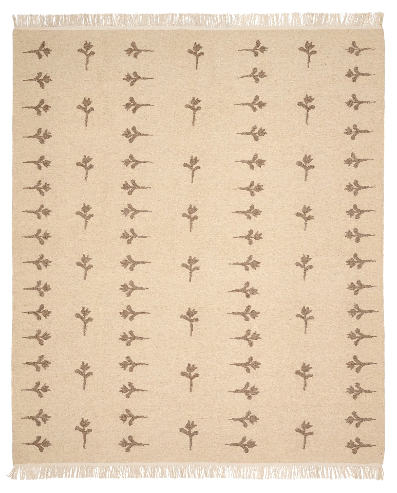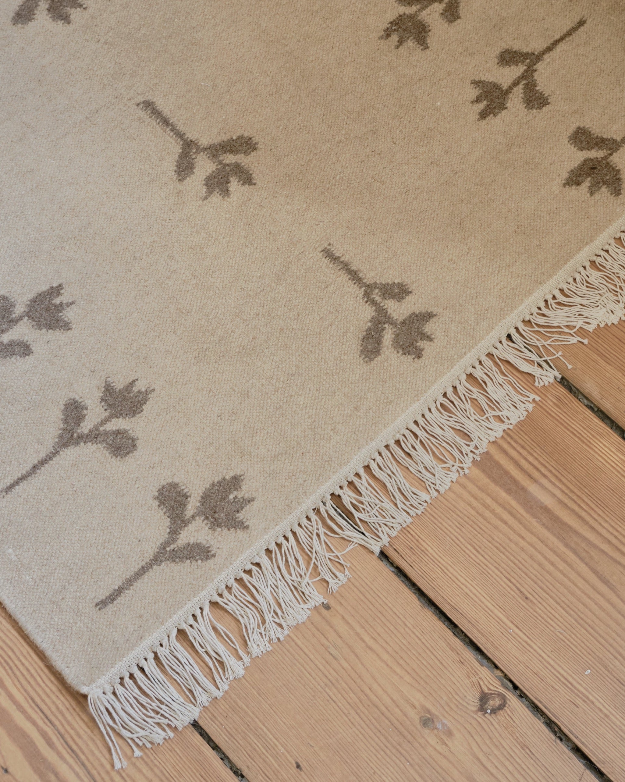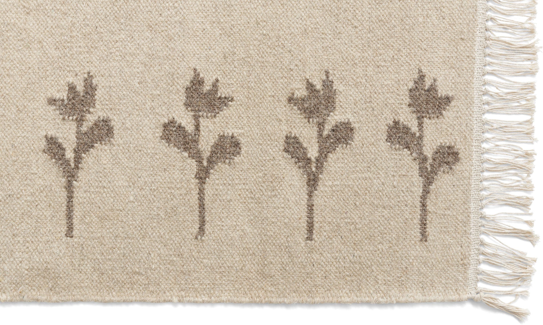 no.17 is a light, flat-woven rug in natural wool. The rug is designed in a mid-beige foundation with soft-brown woven flowers that draw inspiration from ancient Scandinavian tulip patterns, A thin fringe row decorates the edges, providing a simple but important detail to the overall design.
