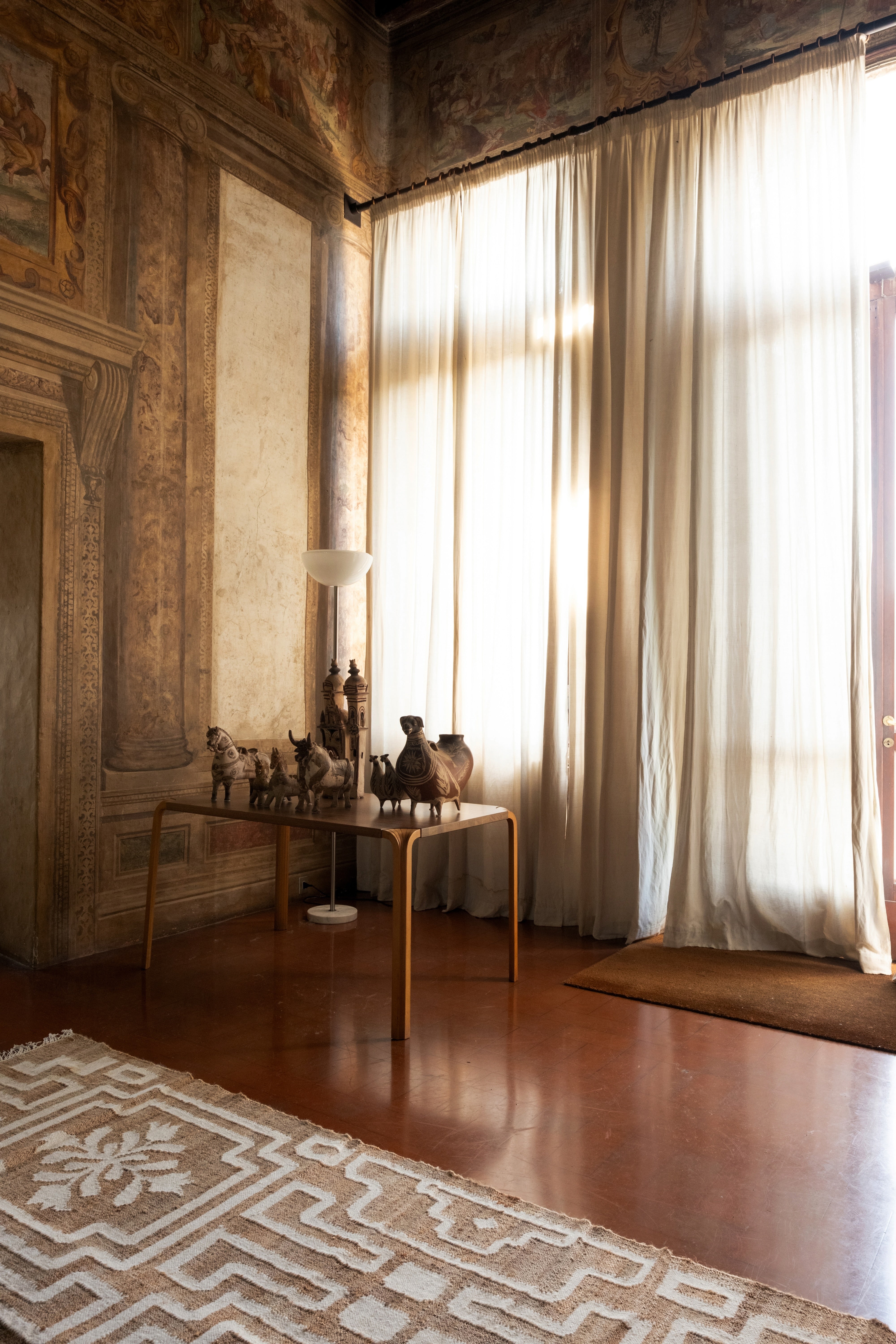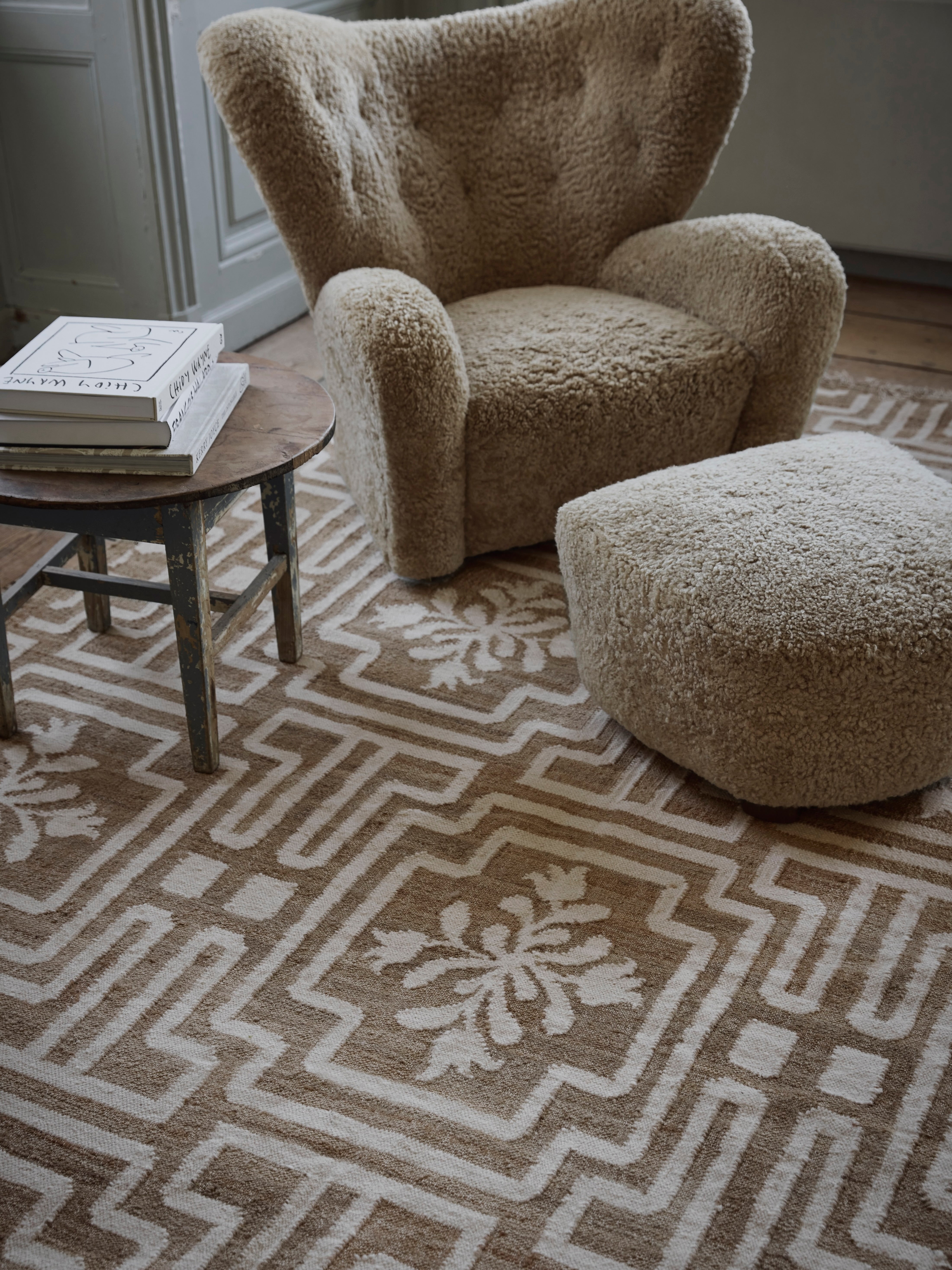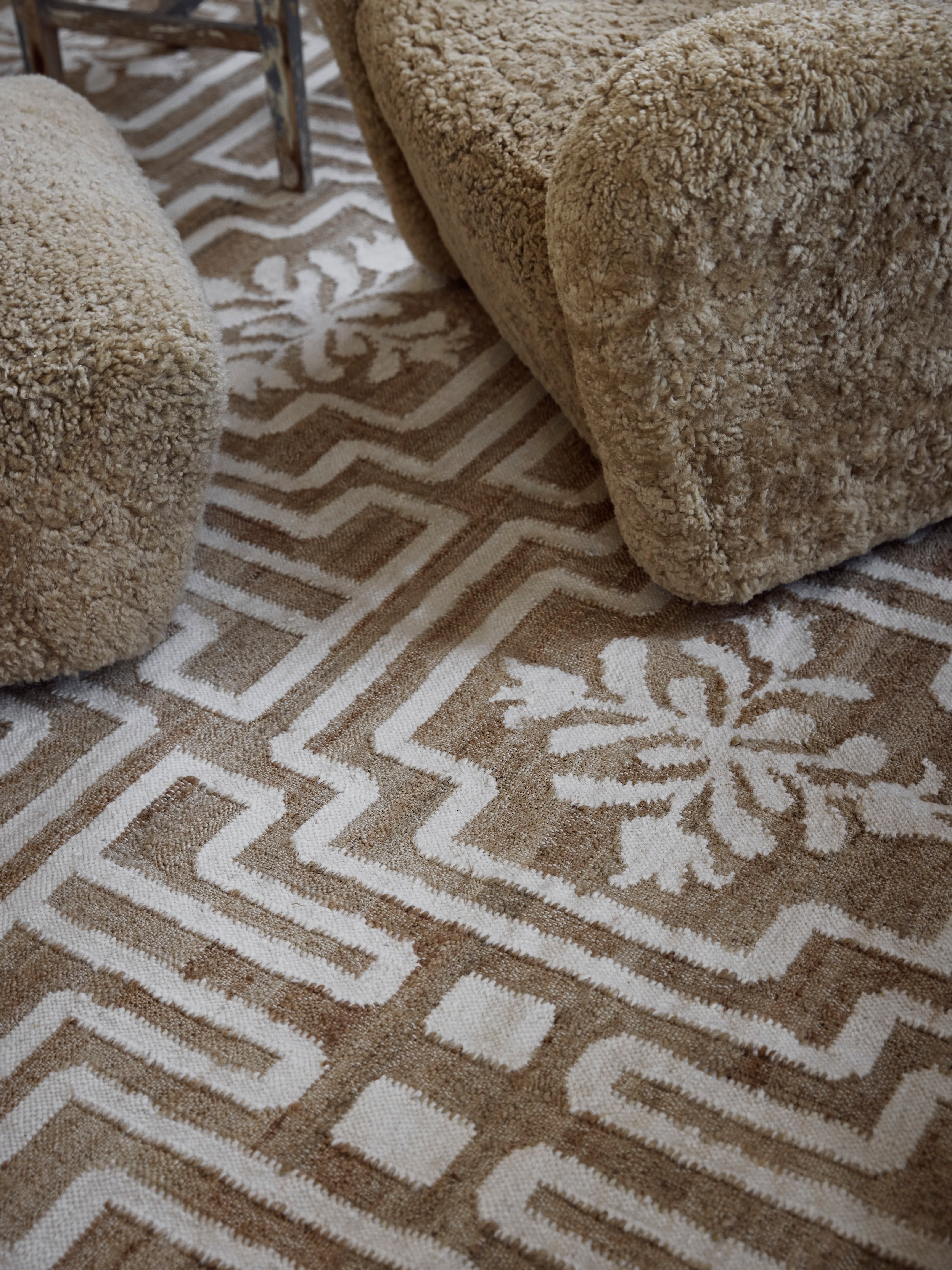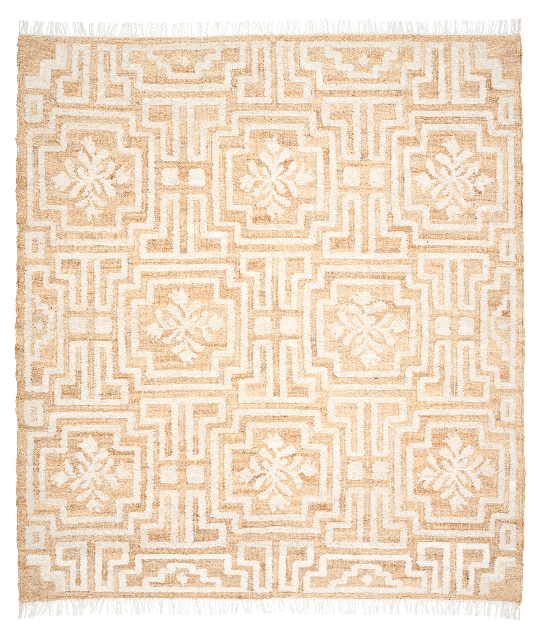 no.22 is a light, flat-woven, rug crafted from natural jute and wool. The rug features a natural jute foundation, adorned with a graphical floral motif in white natural wool, combining hard and soft elements through contrasting patterns.